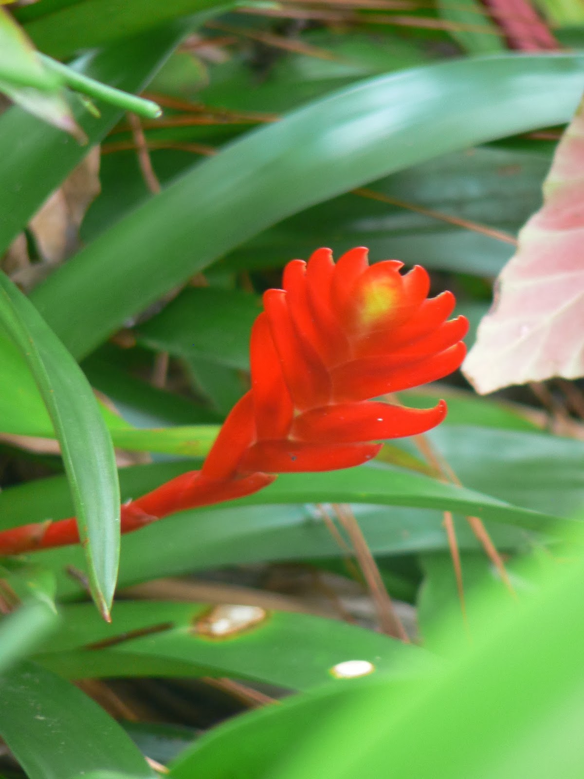 Here is a good example of why this bromeliad is called matchstick. The bloom (partly hidden by the coleus) at this stage looks very much like little matches.